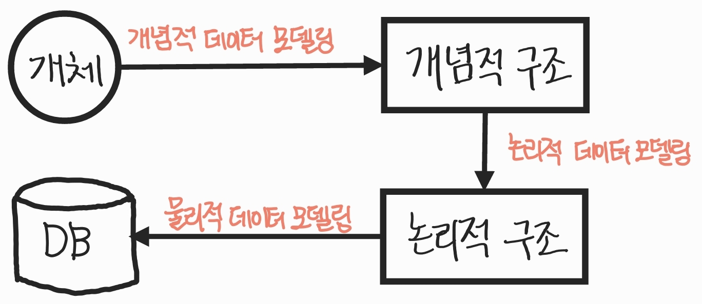 - 현실에서는 개념적 데이터 모델링 → 논리적 데이터 모델링 → 물리적 데이터 모델링 순으로 수행하는 경우는 드물며, 개념적/논리적 데이터 모델링을 함께 수행하는 경우가 대부분임.