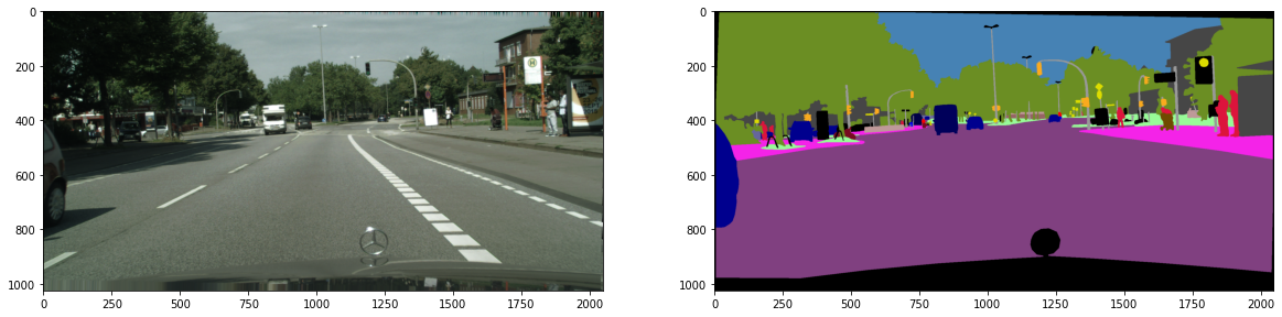 두 개의 이미지를 하나로 합치는 처리 과정을 코드로 살펴보겠습니다. 우선, 여기서 사용할 도로 이미지와 여기에 해당하는 Segmentation 라벨 이미지를 시각화하여 확인합니다.