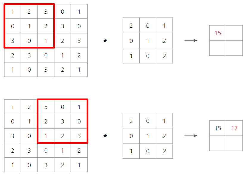 합성곱 연산은 필터를 일정한 간격으로 이동하며 입력 데이터와 대응되는 원소끼리 곱하고 총합을 구합니다. 먼저, 빨간색으로 박스 친 부분에 대해서 필터를 적용하면 식 (1)과 같이 계산됩니다. 그 결과를 해당하는 위치에 저장하고, 이 과정을 모든 위치에서 수행하면 화살표 오른쪽과 같은 합성곱 연산의 출력을 얻을 수 있습니다.