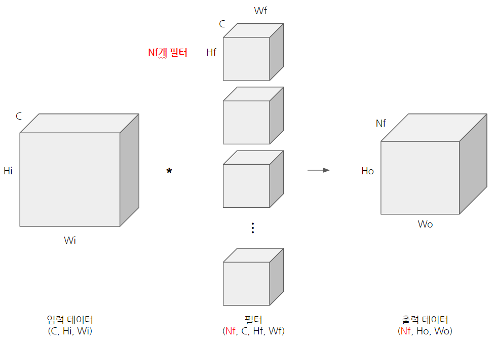 위 그림의 출력 데이터는 하나의 채널을 갖습니다. 출력 데이터를 다수의 채널로 내보내기 위해서는 다수의 필터를 사용해야 합니다. 아래 그림과 같이 Nf개의 필터를 적용하면 출력 데이터도 Nf개의 채널이 생성됩니다.
