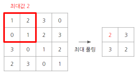 풀링은 높이, 너비 방향의 크기를 줄이는 연산입니다. 줄이는 방법으로 최대 풀링(Max Pooling), 평균 풀링(Average Pooling)이 주로 사용됩니다. 우선 그림을 통해 풀링 연산이 어떻게 이뤄지는지 살펴보겠습니다. 아래 그림은 2 * 2 최대 풀링을 스트라이드 2로 처리한 결과입니다. 일반적으로 풀링의 크기와 스트라이드는 같은 값으로 설정합니다 (여기서는 2 입니다).