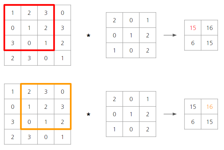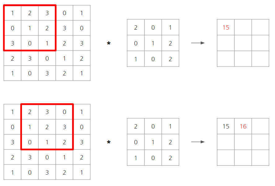 식 (2) : 2*2 + 3*0 + 0*1 + 1*0 + 2*1 + 3*2 + 0*1 + 1*0 + 2*2 = 16