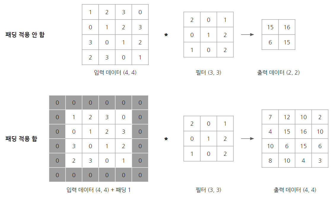예를 들어, (4, 4) 크기의 입력 데이터에 (3, 3) 필터를 합성곱 연산한다고 가정하겠습니다. 패딩을 적용하지 않는 경우에는 출력 데이터의 크기가 (2, 2)로 줄어들지만, 패딩을 적용하면 출력 데이터의 크기가 (4, 4)로 입력 데이터의 크기로 유지되는 것을 볼 수 있습니다.