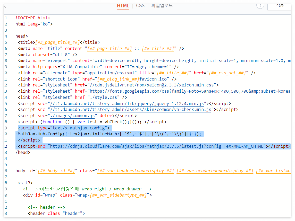 이번에 티스토리 스킨을 새로 나온 Odyssey로 변경했는데, 예전에 작성한 글들을 확인해보니 수식이 전부 깨져서 나오더라구요ㅠㅠ 원인은 스킨 변경하면서 HTML에 추가했었던 수식 설정이 삭제된 것으로 추정됩니다.