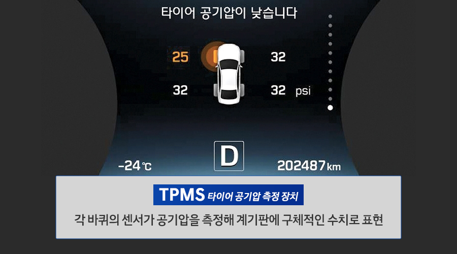 - 각 바퀴의 센서가 공기압을 측정해 계기판에 구체적인 수치로 표현
