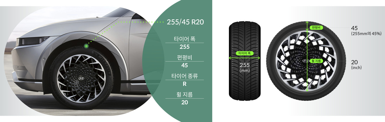 - 제원 235/45 R21 : 235 mm 폭에 45% 편평비를 가진 21인치 타이어
