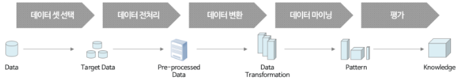 - "데이터셋 선택(Selection)" - "데이터 전처리(Preprocessing)" - "데이터 변환(Transformation)" - "데이터 마이닝(Data Mining)" - "평가(Interpretation / Evaluation)"의 5단계로 구성