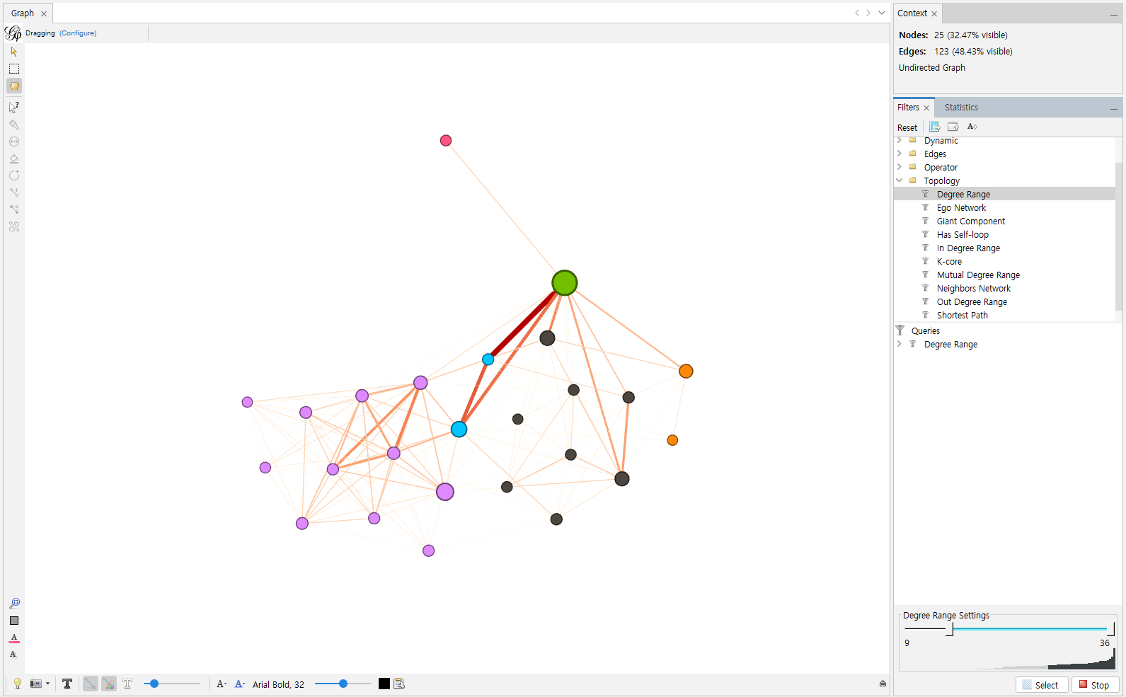 * Statistics 탭을 사용해 계산한 집합 속성에 따라 그래프의 특정 하위 영역을 필터링하고 시각화 함