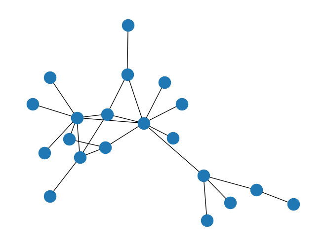 G = nx.extended_barabasi_albert_graph(n=20, m=1, p=0.2, q=0.2) # n: 최종 노드 개수, m: 각 새 노드가 연결될 간선 개수, p: 부가적 선호 연결 확률, q: 노드 생성 확률