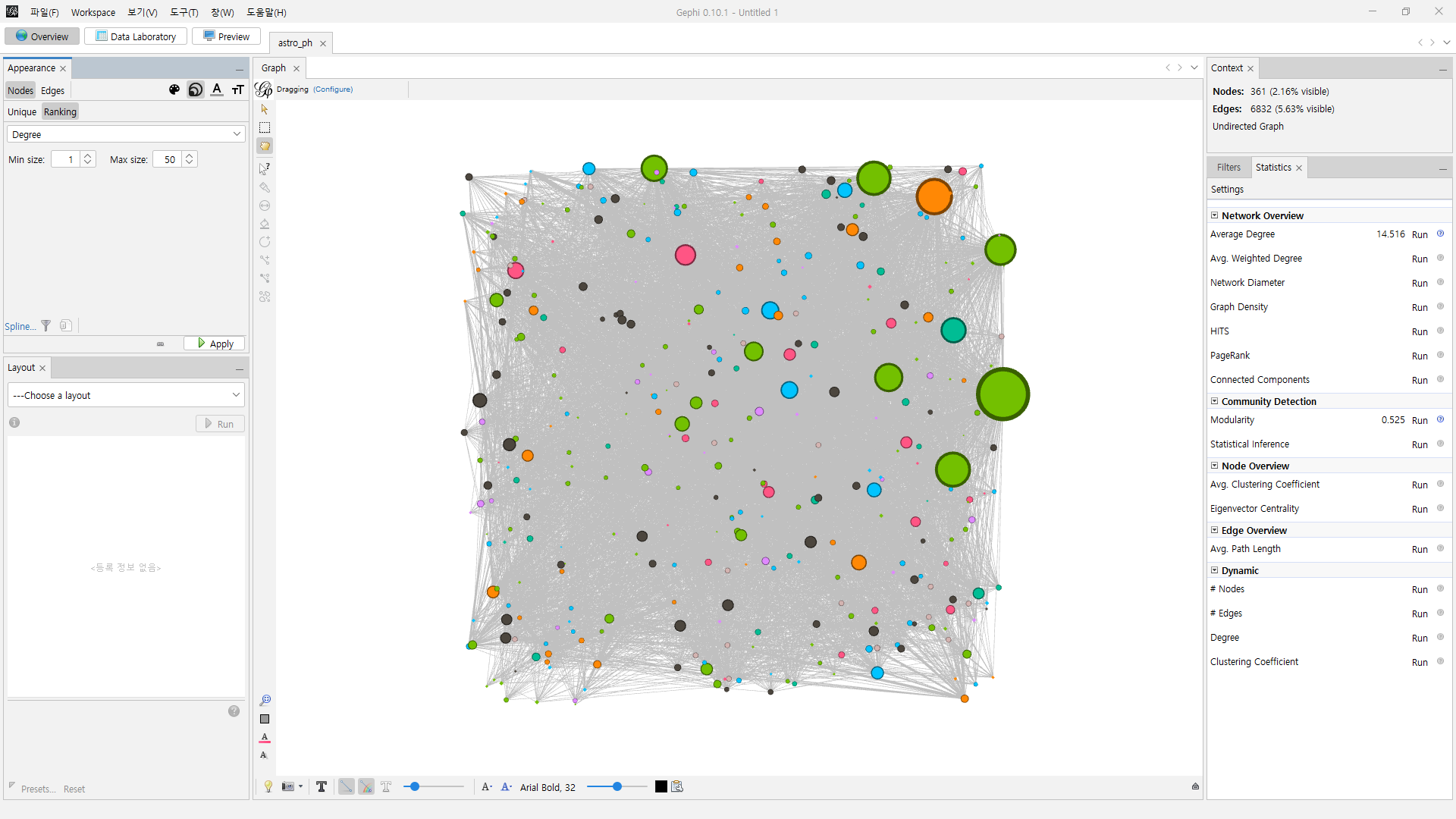② [Appearance] 탭 ▶ [Nodes] TT (Label Size) 아이콘 ▶ [Ranking]에서 "Degree" 선택하고 Min size 0.5, Max size 1 입력