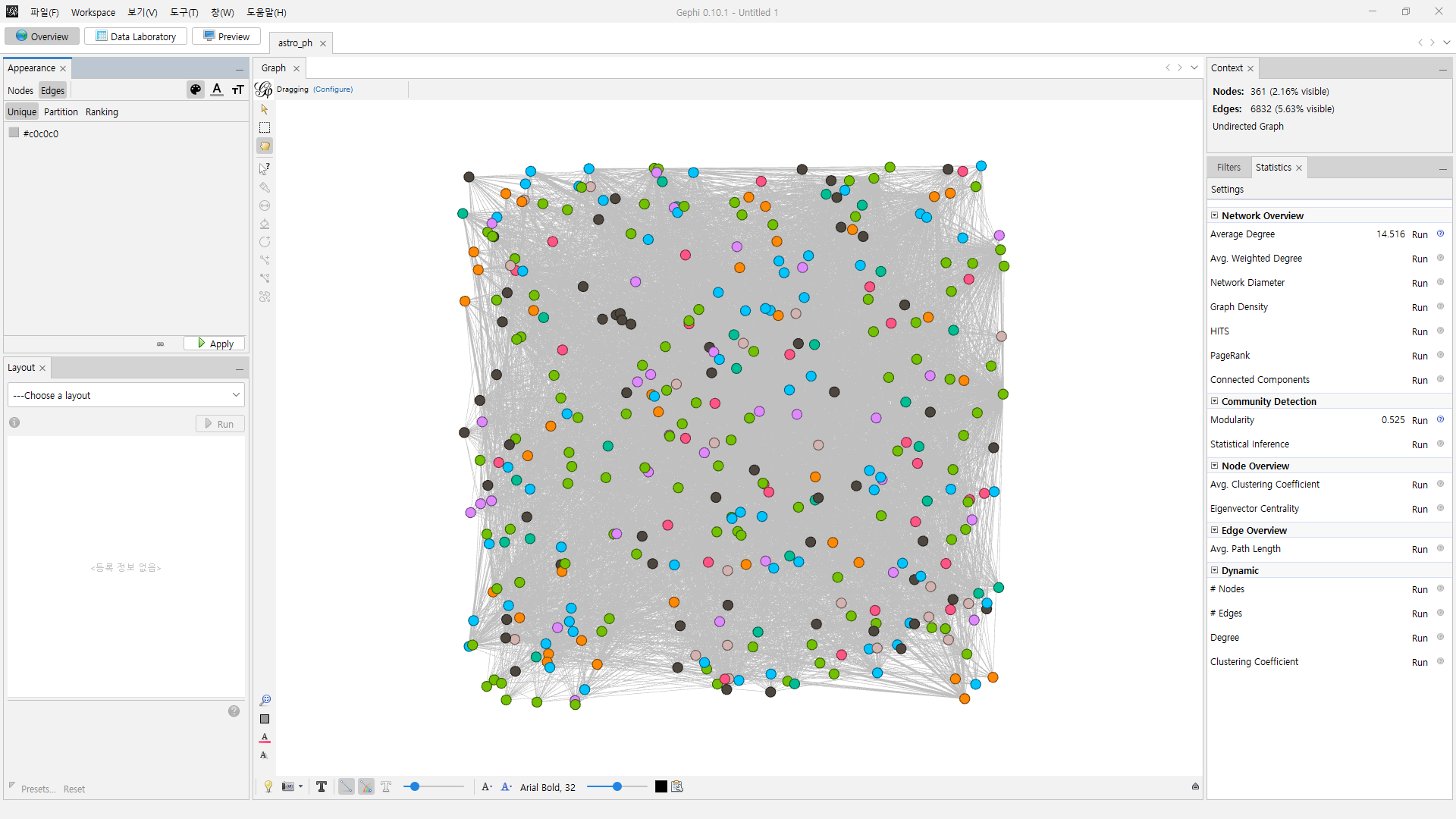 ① [Statistics] 탭 ▶ [Community Detection] 탭 ▶ "Modularity"의 [Run] 실행