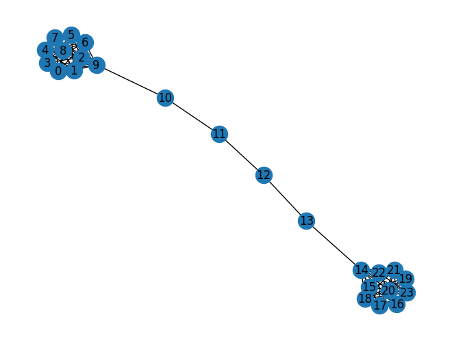 G = nx.barbell_graph(m1=10, m2=4) # 예제 그래프